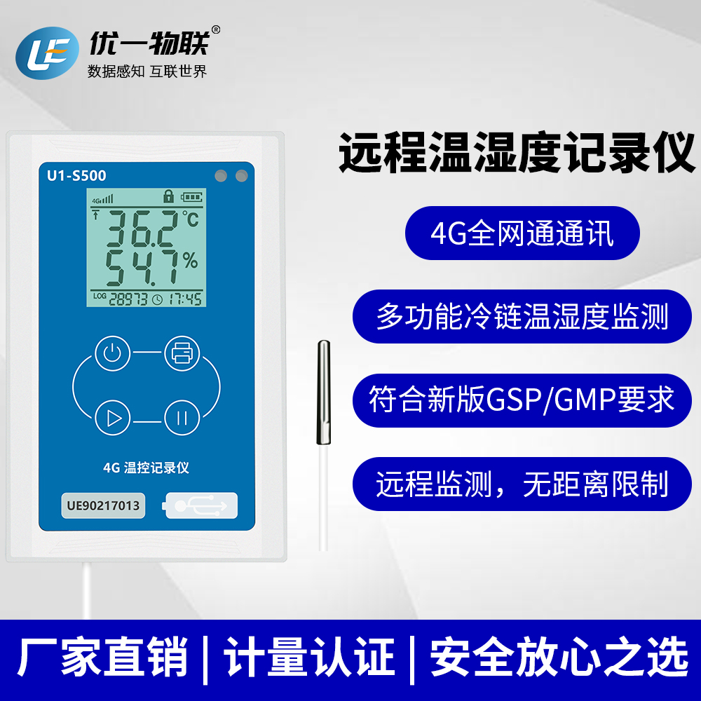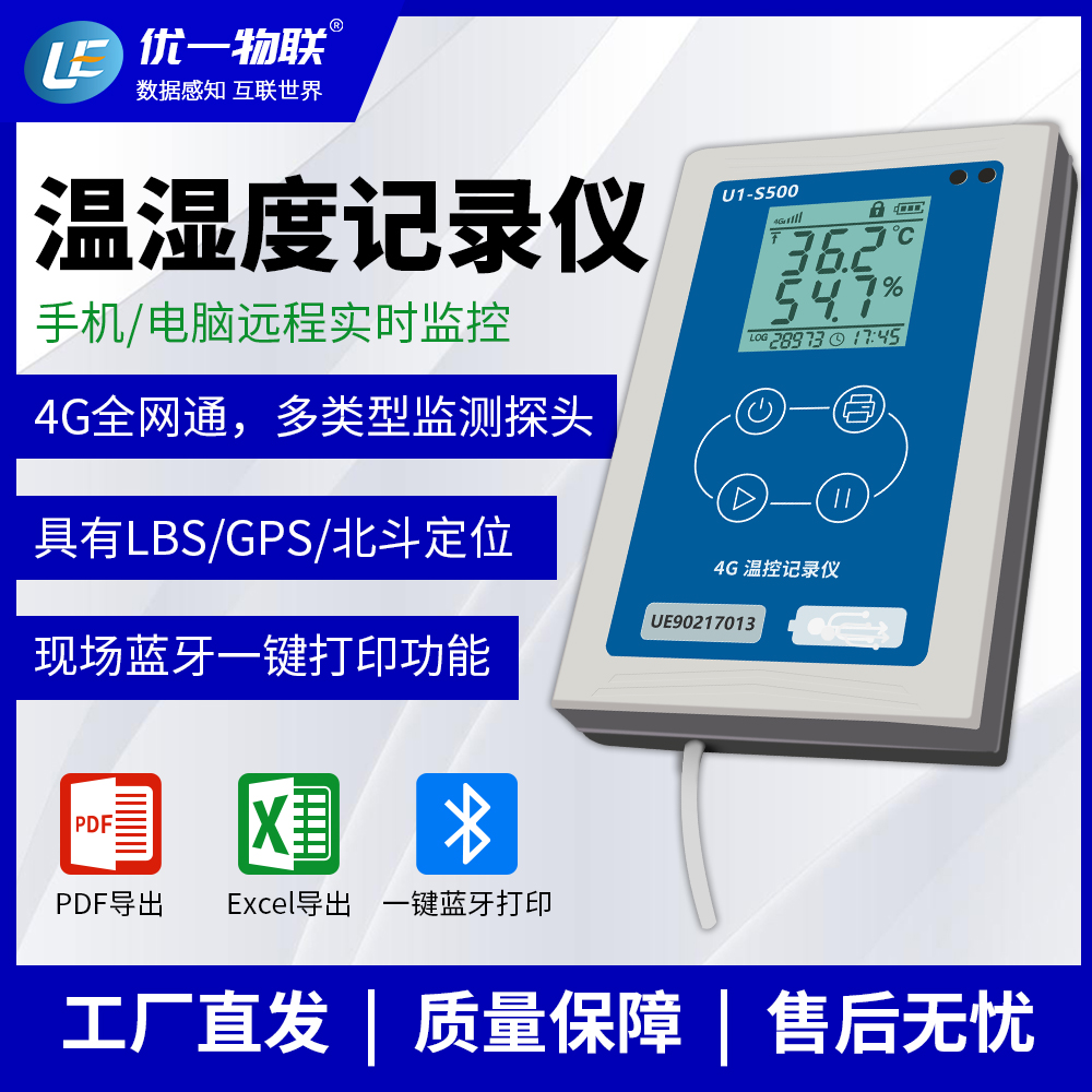 U1-S500 系列是一款應用于保溫箱、冷藏車、冰箱、倉庫等應用場景的4G溫控記錄儀,具有安裝支架,使用4G 網絡實時上傳數據,同時具有LBS+GPS/北斗定位、現場藍牙打印等功能,滿足冷鏈物流操作中,現場交付冷鏈全過程的溫濕度數據記錄的要求。