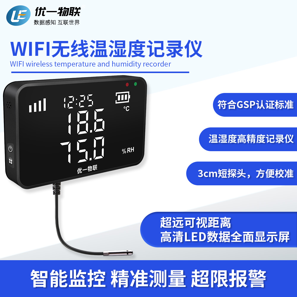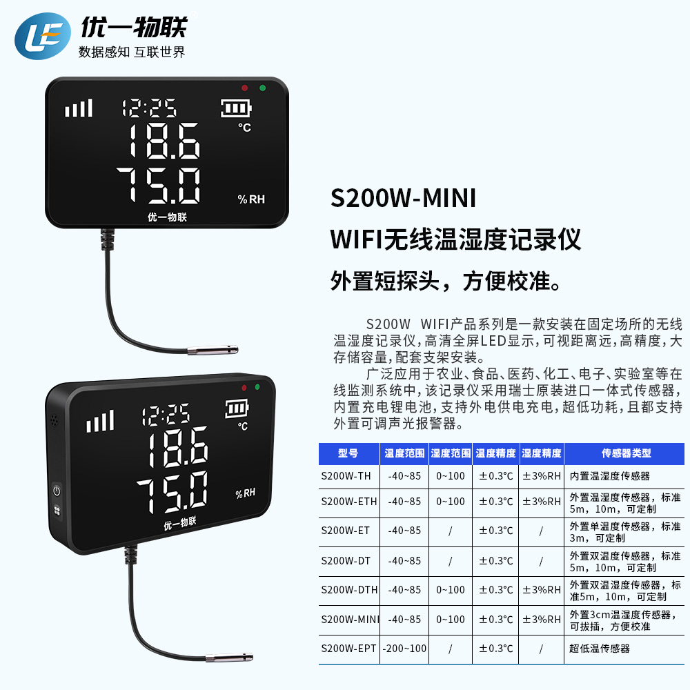 S200W WIFI產(chǎn)品系列是一款安裝在固定場(chǎng)所的無線溫濕度記錄儀,高清全屏LED顯示,可視距離遠(yuǎn),高精度,大存儲(chǔ)容量,配套支架安裝。 廣泛應(yīng)用于農(nóng)業(yè)、食品、醫(yī)藥、化工、電子、實(shí)驗(yàn)室等在線監(jiān)測(cè)系統(tǒng)中,該記錄儀采用瑞士原裝進(jìn)口一體式傳感器,內(nèi)置充電鋰電池,支持外電供電充電,超低功耗,且都支持外置可調(diào)聲光報(bào)警器。